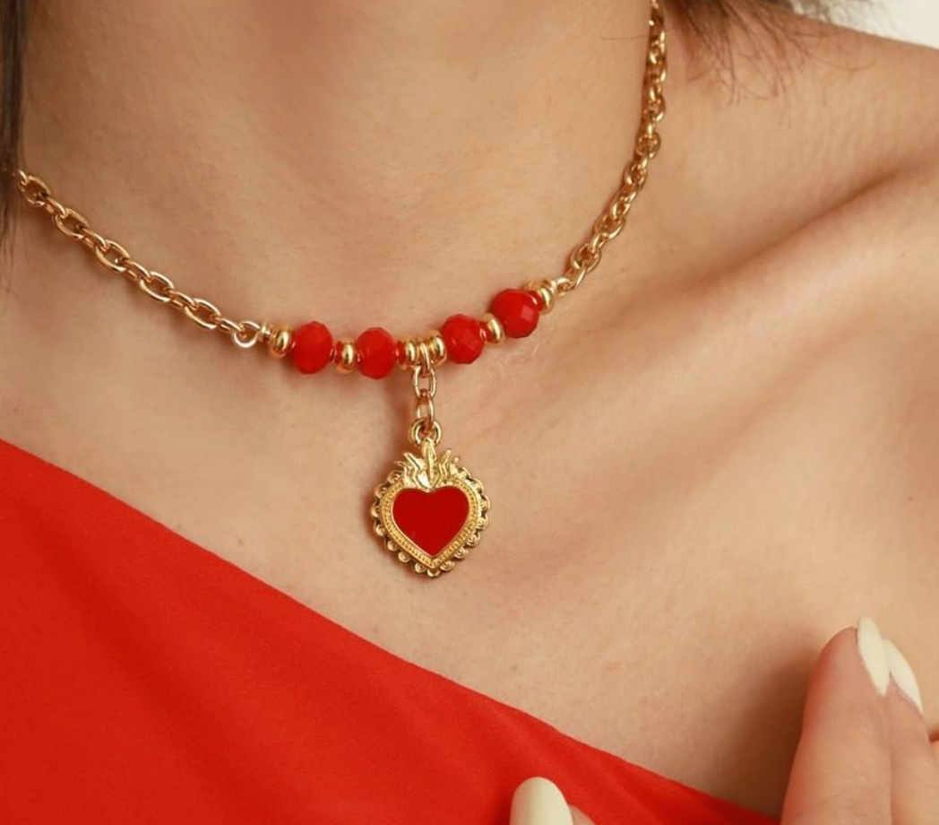 - Materiales:Dije de corazón esmaltado piedra ágata y cadena chapa de oro 24k