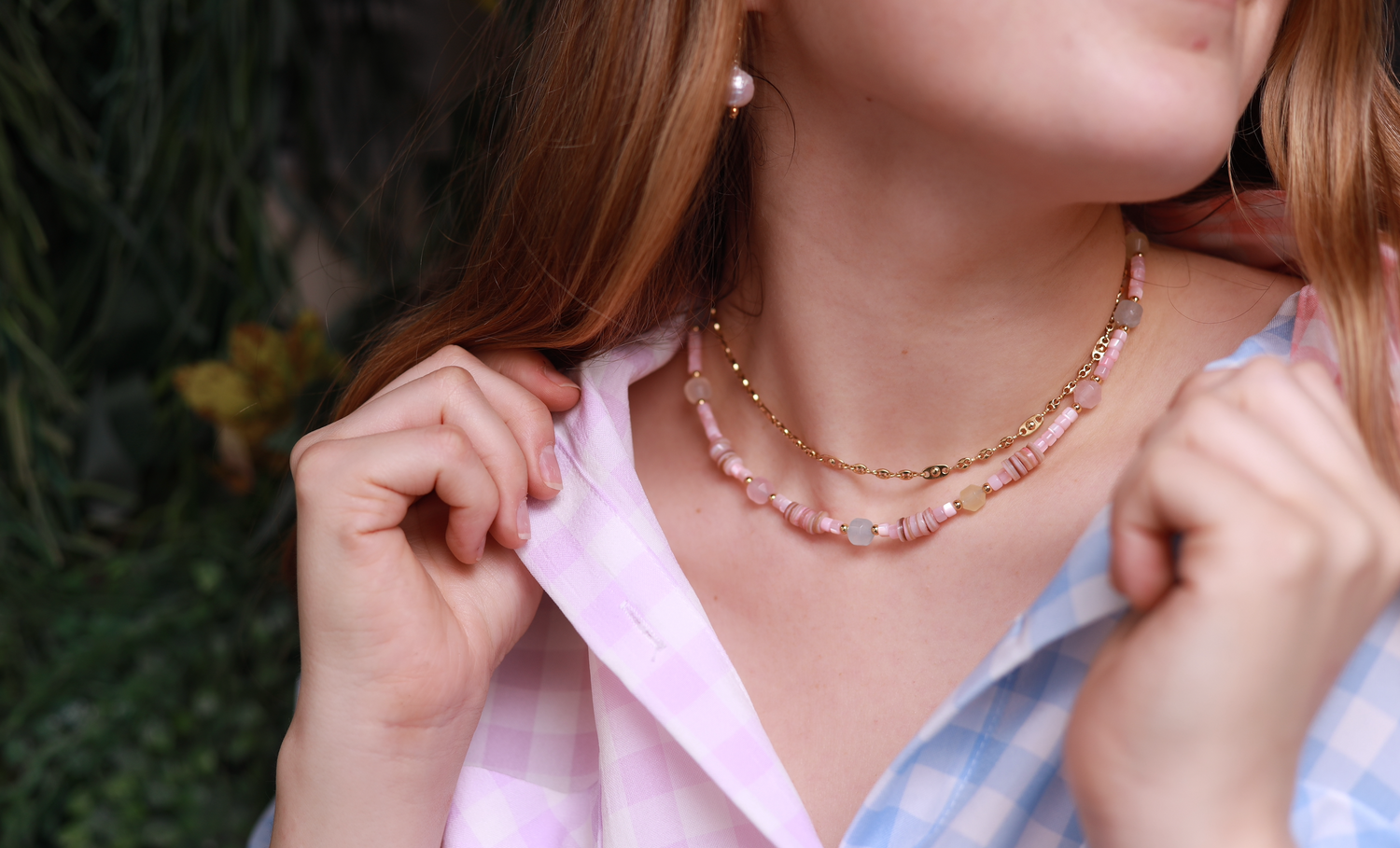 - Materiales: Piedras naturales con rondanas de ágata y cubos de madre perla, chapa de oro